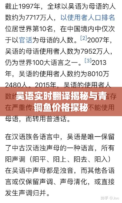 在当今全球化的时代,语言交流的重要性日益凸显,吴语,作为汉语的一种方言,其独特性和魅力正逐渐受到关注,随着收藏市场的繁荣,青铜鱼等文物古董的价格也成为人们关注的焦点,本文将介绍吴语的实时翻译技术及其与青铜鱼价格之间的关联。