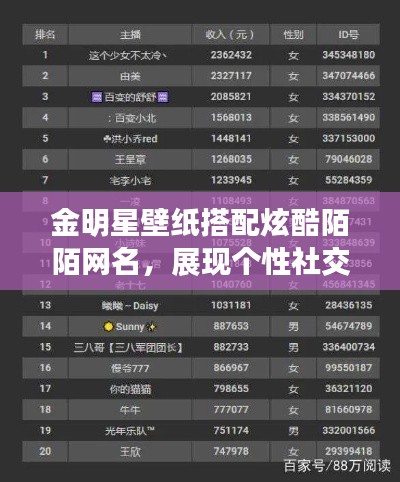 亲爱的朋友们,你是否厌倦了单调乏味的手机屏幕?是否渴望拥有一款与众不同的壁纸和独特的网名来展现你的个性魅力?我们将为你带来一系列金明星壁纸和最新流行的陌陌网名推荐,让你在社交场合中独树一帜,成为众人瞩目的焦点!