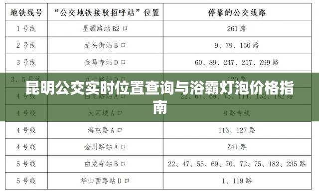 昆明公交实时位置查询与浴霸灯泡价格指南,本文主要围绕两大核心主题展开:一是如何在昆明查询公交车的实时位置,二是关于浴霸灯泡的价格问题,这两个主题看似毫无关联,但在日常生活中都与我们的生活息息相关,本文将全面释义这两个关键词及其组合,帮助读者解决生活中的实际问题。