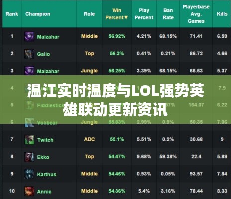 随着夏季的到来,炎炎烈日下,人们纷纷寻找避暑胜地,而电子竞技作为一种新兴的休闲方式,吸引了众多年轻人的目光,本文将结合当前天气热点和电子竞技游戏《英雄联盟》(League of Legends,简称LOL)的最新版本,为大家带来一场关于温江实时温度与LOL最新版本强势英雄的精彩解读。